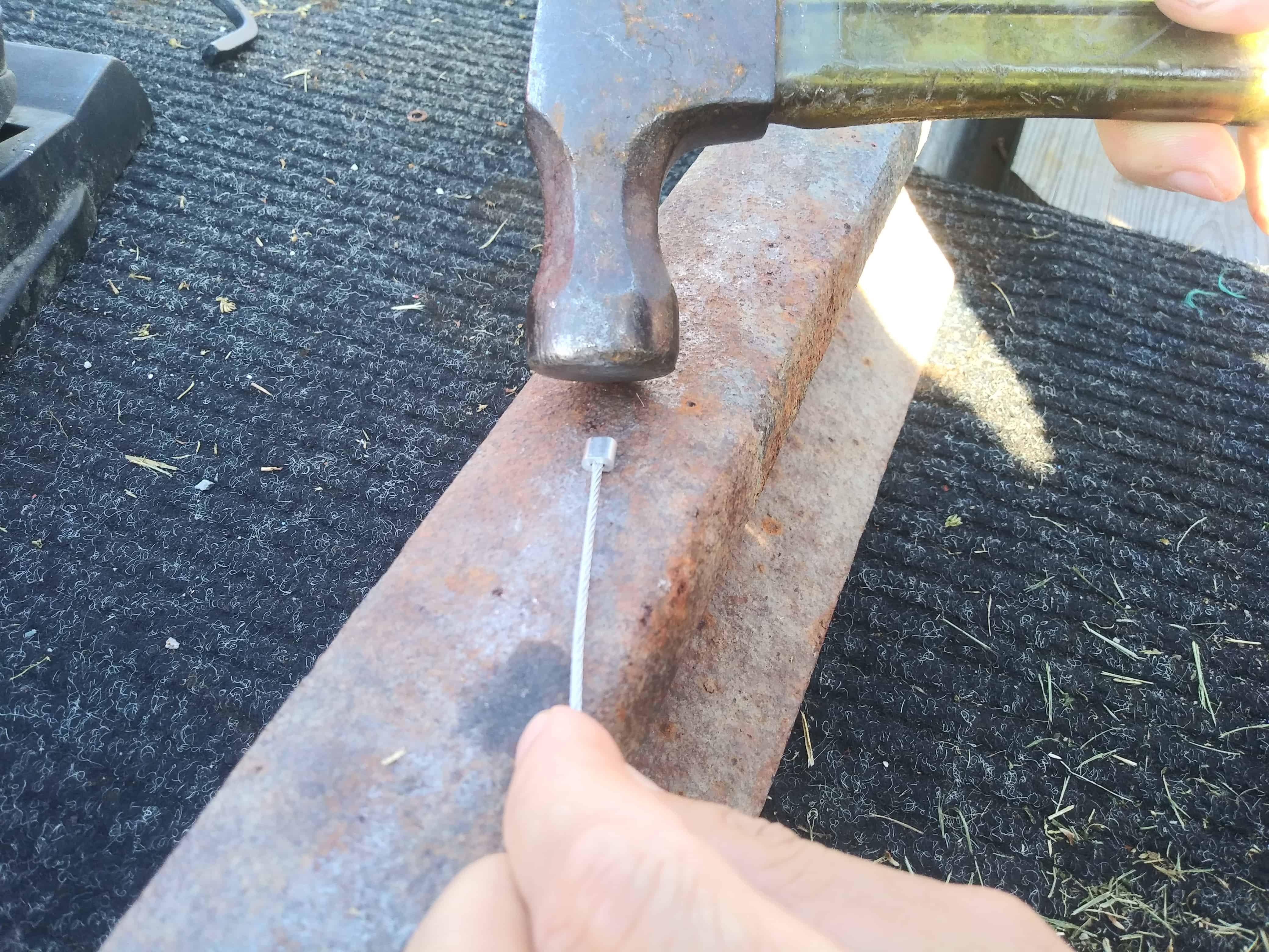 Hammer the end stop into the cable, it does not take much force, you don’t want them smashed flat, just enough to grab the cable.