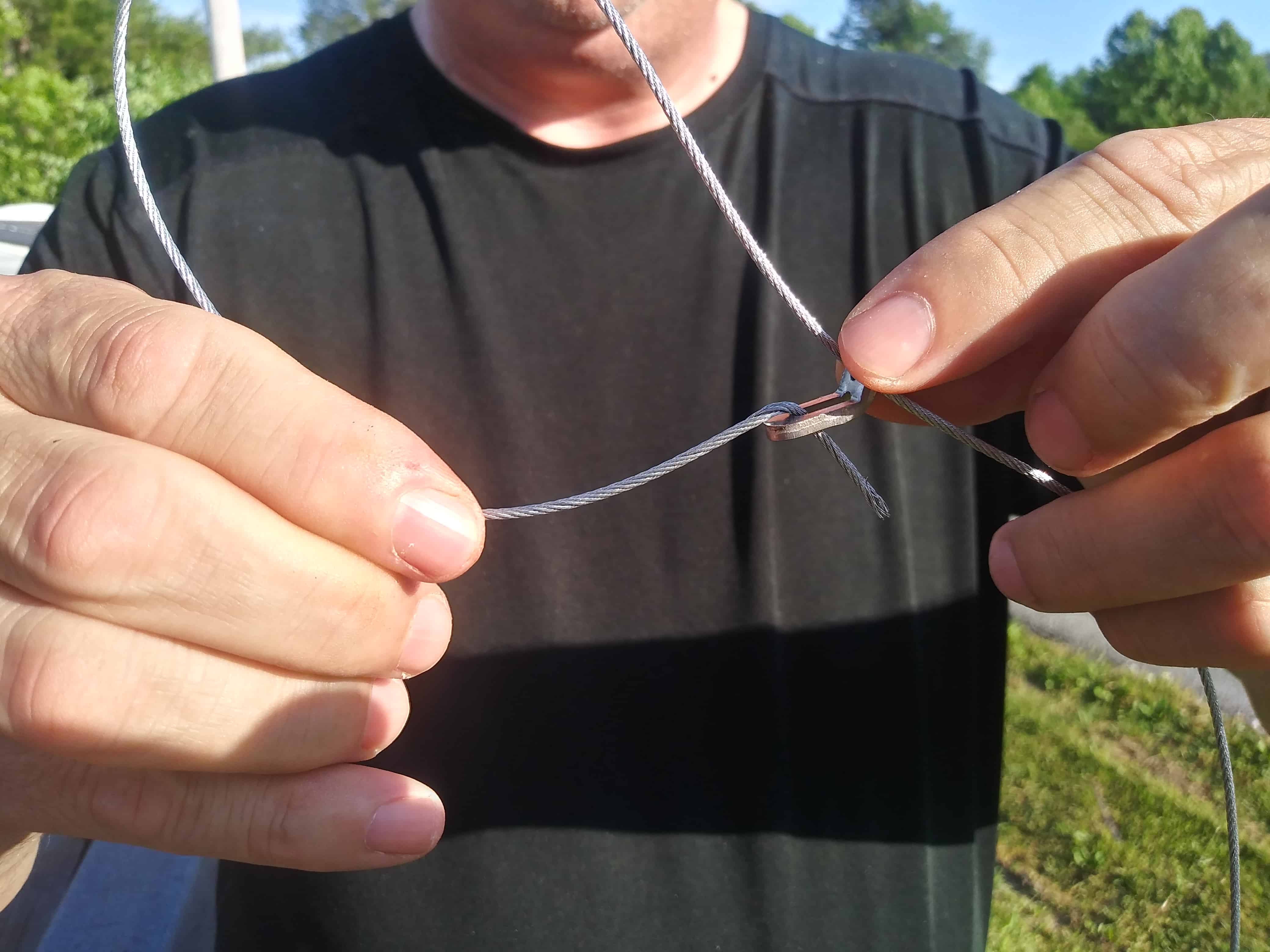 Cut the cable to your desired length. We recommend 3 – 4 ft for small snares, 5 – 6 ft for medium and 7 – 8 ft for large snares. Once you have your cable cut there is a very important crucial step required. Hold the cable (balanced on one finger) to see the lay of the cable.
