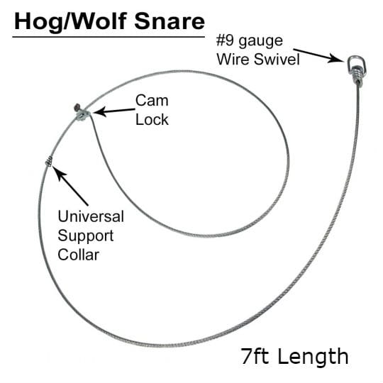 3/32 7×7 cable, cam lock, 7 feet long. Superior holding power. Can be used for beaver, feral hog, coyote, wolf, bear, deer, alligator and other big game. This snare is a favorite among survivalists as well. A few of these in the bug out bag will ensure you means of catching food due to their ability to take deer and feral hogs easily. The Cam Lock Snare is truly a survivalists best friend!